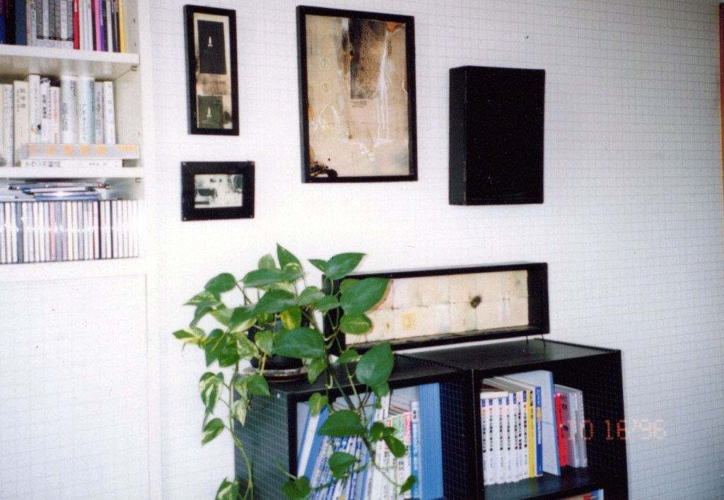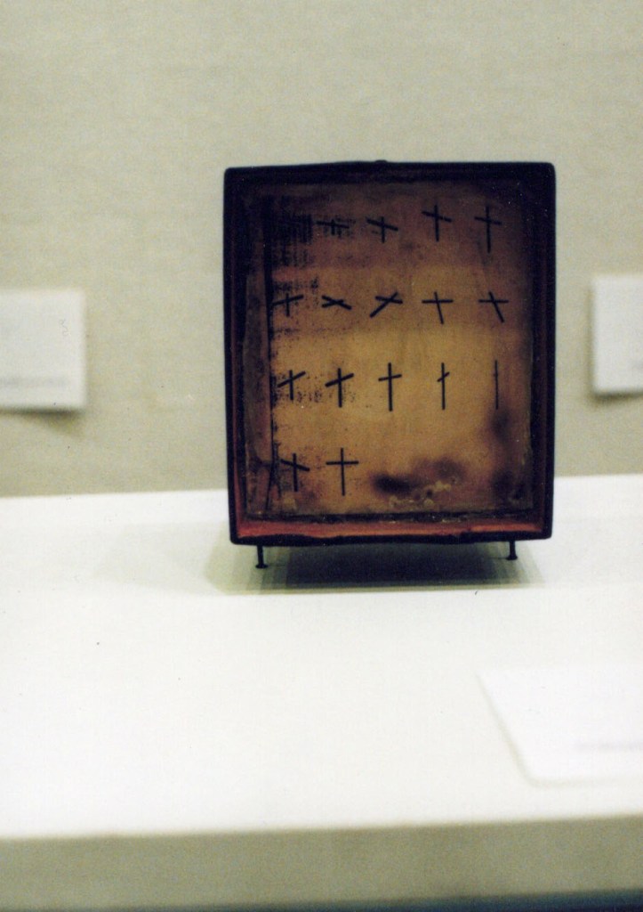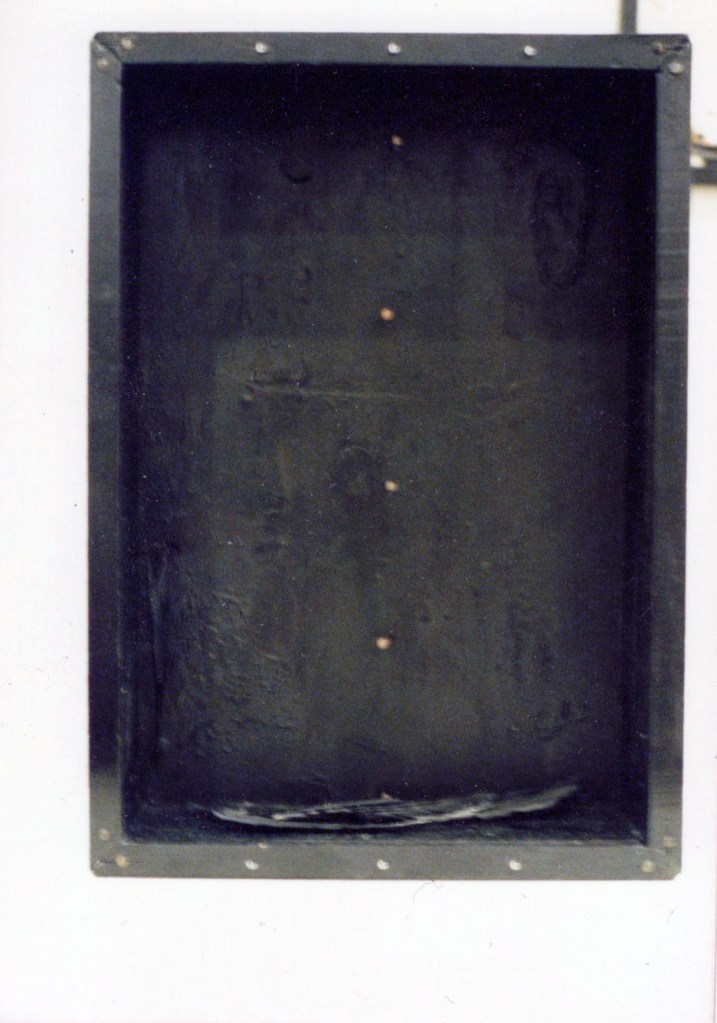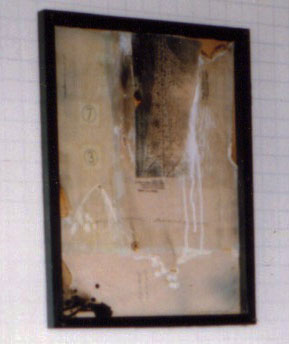 photocopied computer graphics on tracing paper, watercolor, black ink, and nails on paper box