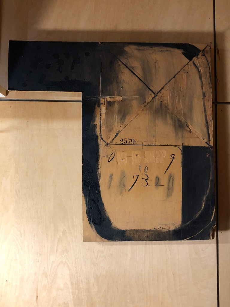 Oil, pencil, charcoal, lettering sheet, and nails on wood